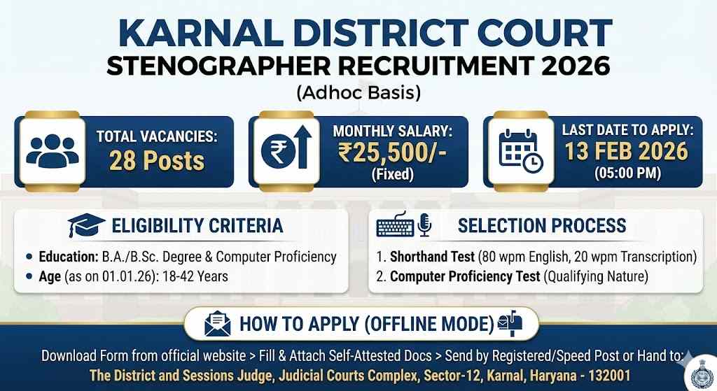 The Office of the District and Sessions Judge, Karnal, has released an employment notification for the Karnal Court Stenographer Recruitment 2026. Applications are invited from eligible candidates to fill 28 vacancies for the post of Stenographer Grade-III on a purely Ad-hoc basis. The offline application process started on 28 January 2026, and the last date to submit the form is 13 February 2026, upto 05:00 PM. Candidates with a Graduation degree and Stenography skills can apply for this Sarkari Naukri. The selection will be based on a shorthand test and a computer proficiency test. Check the details below for the application format and eligibility.